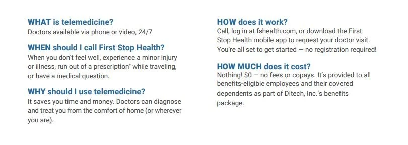 Sometimes the best things in life are FREE! Just like our telemedicine services provided by First Stop Health. Ditech know’s it’s not easy paying for doctor visits all the time so we have partnered in First Stop Health to provide a doctor at your fingertips for all of our full time employees.